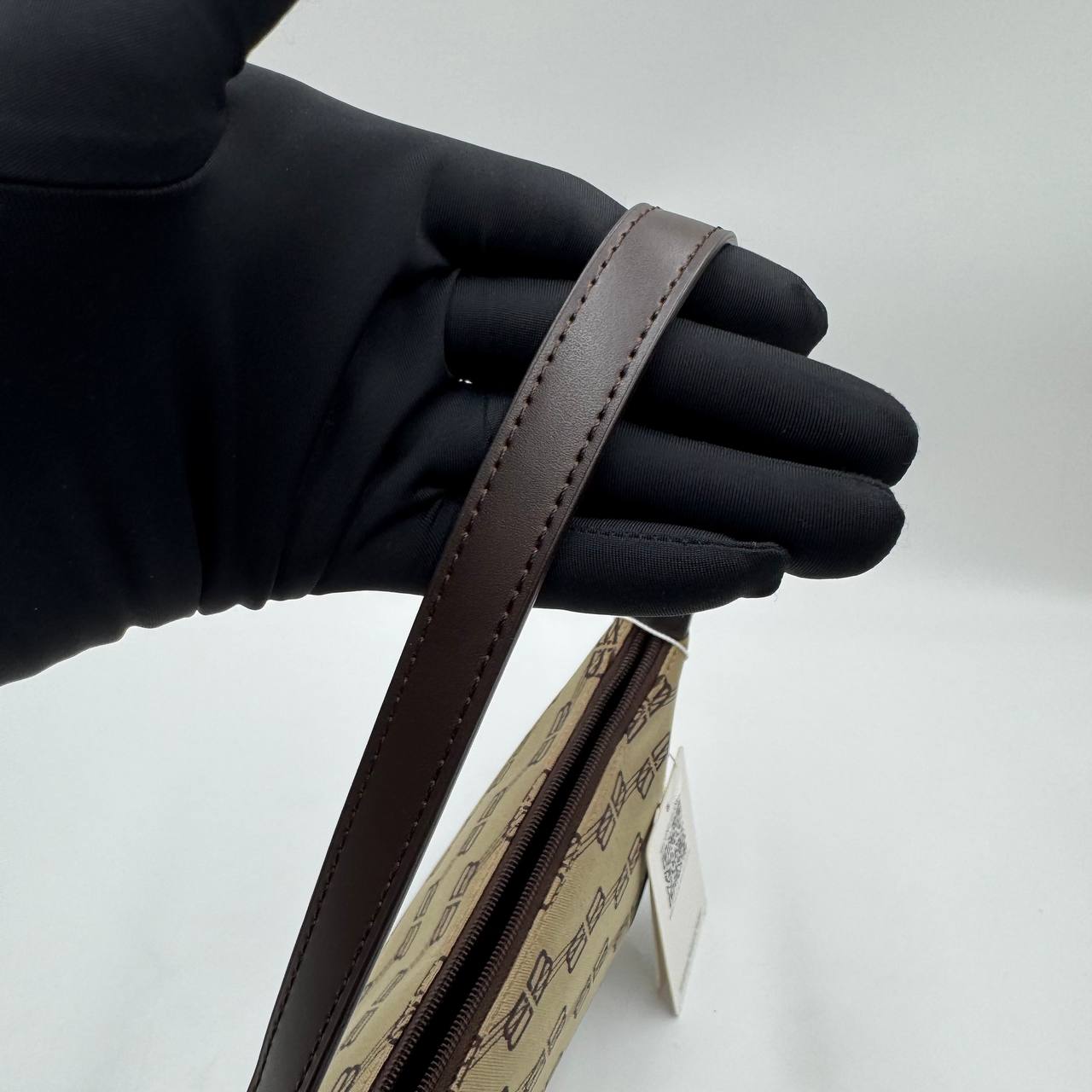 Slim baguette-style silhouette with zip closure