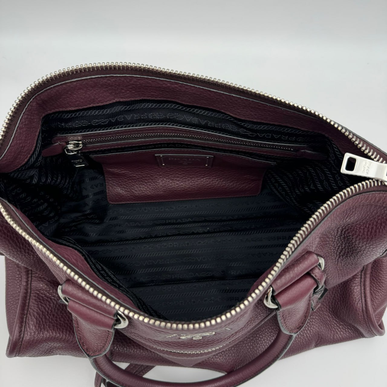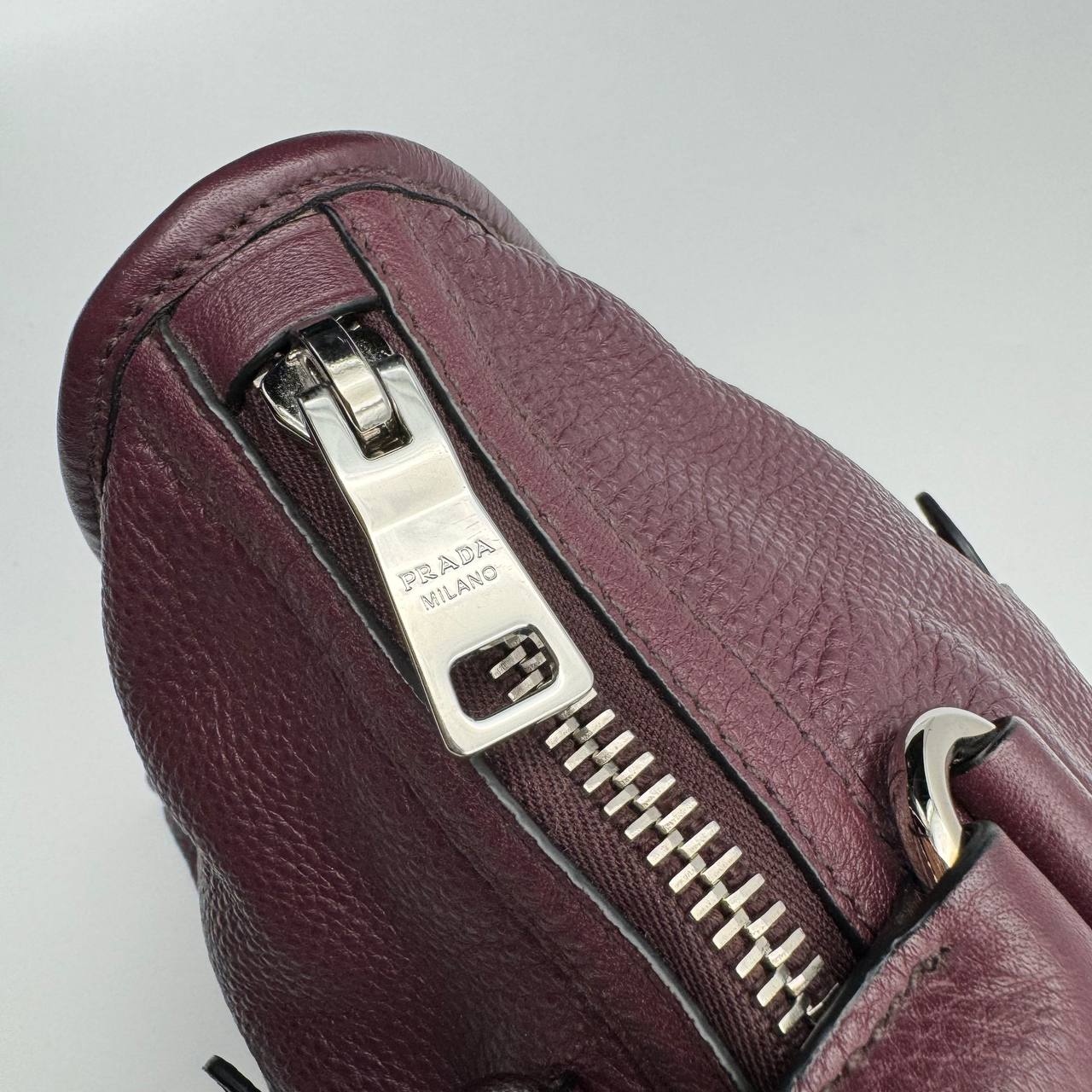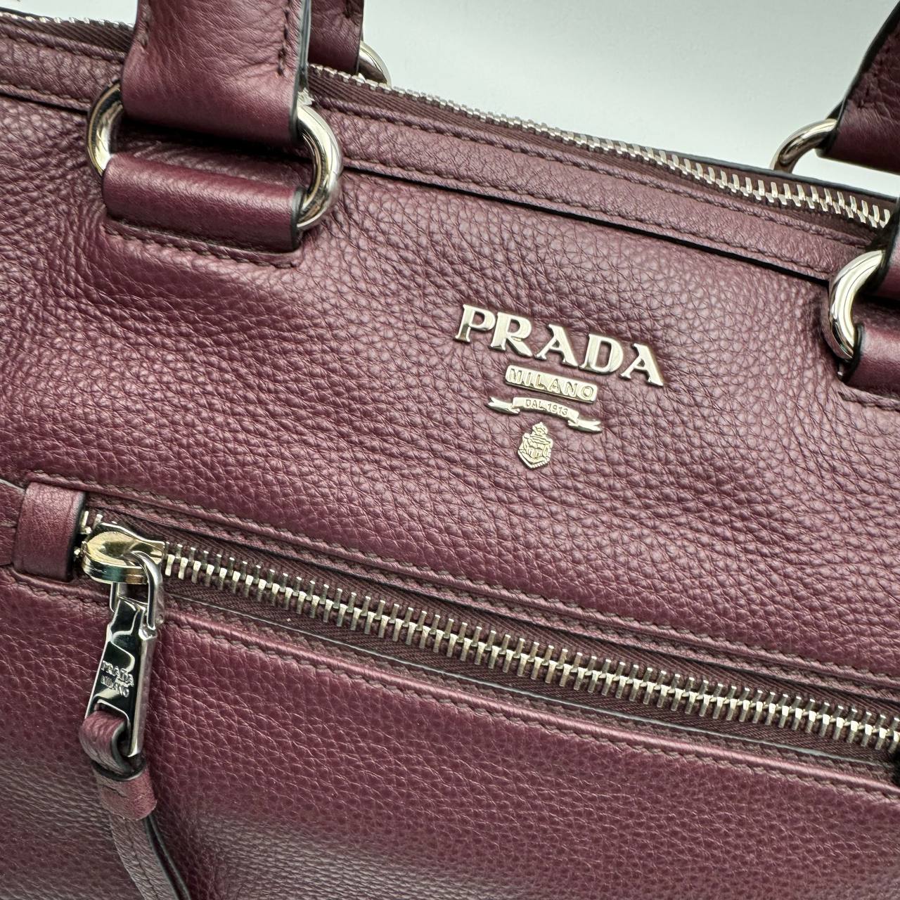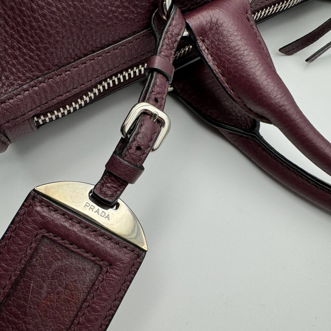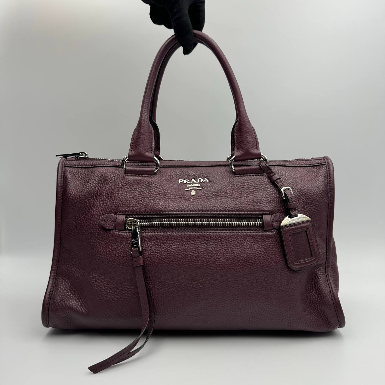 The Prada Bauletto Vitello Phenix is a stylish handbag made from pebbled Vitello Phenix leather. It has a spacious nylon interior, zip pockets, and two rolled handles. The bag also has a detachable leather luggage tag and gold hardware. The Bauletto Vitello Phenix comes in various styles, including satchels and crossbody bags. The satchel has a leather body, rolled leather handles, a detachable flat strap, a top zip closure, and an interior zip pocket. The clay color satchel has a two-way zip closure and a fine Prada logo jacquard textile lining.