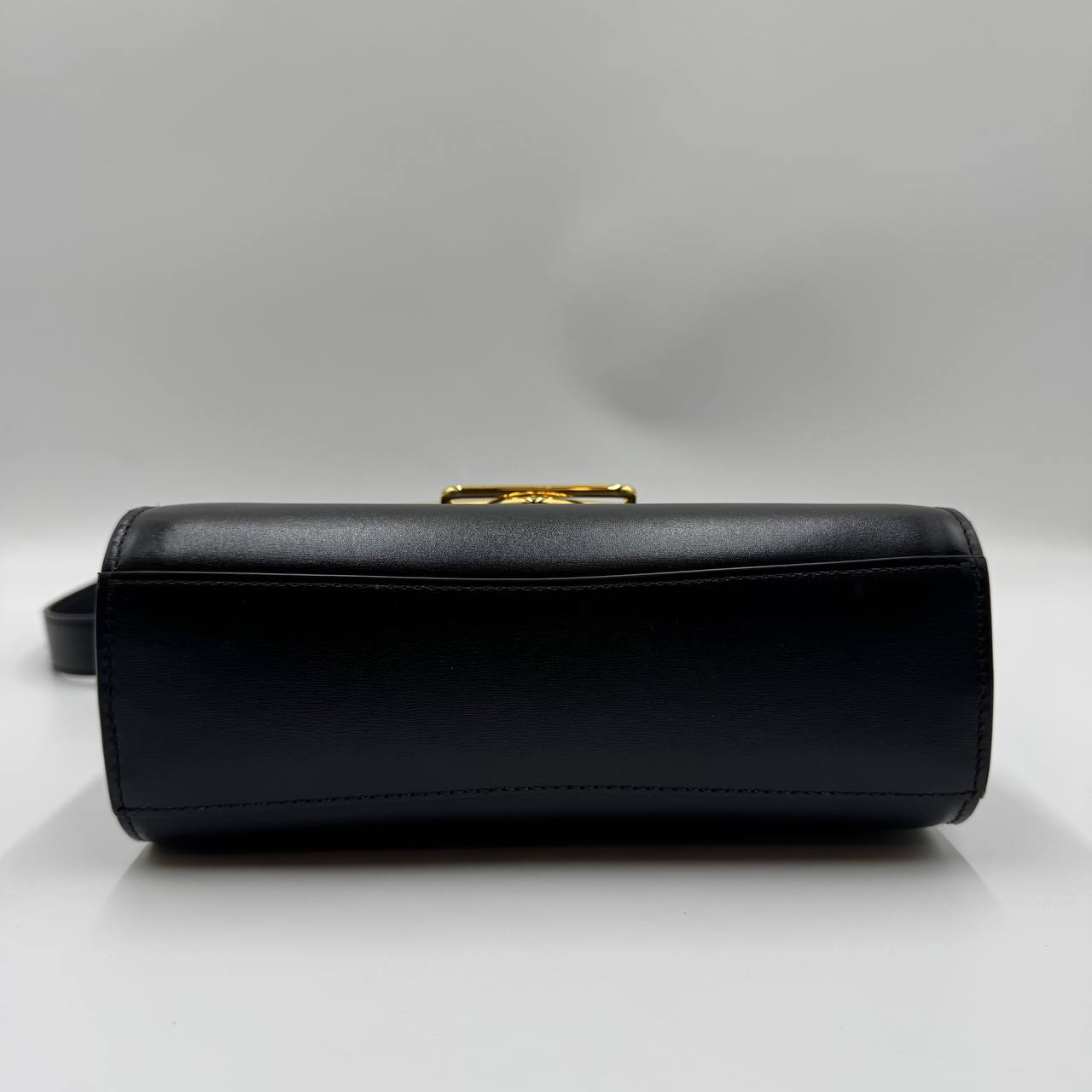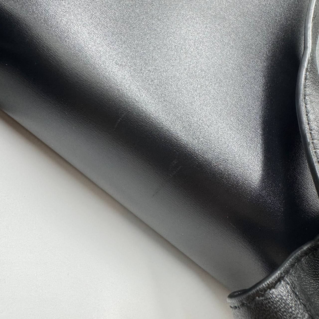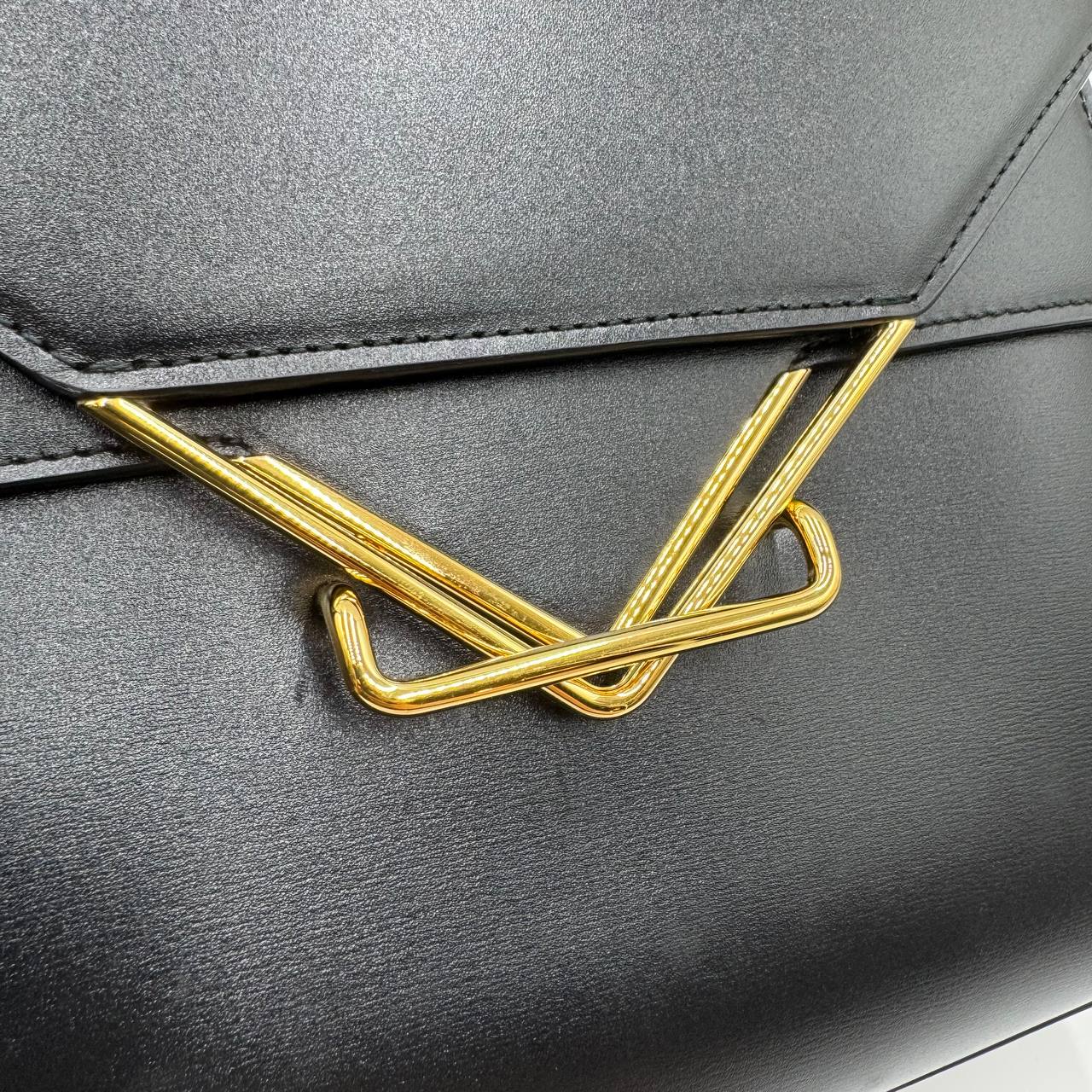 Sleek and sculptural, this Bottega Veneta Point Top Handle Bag is a standout piece known for its iconic gold-tone geometric V-shaped clasp. Crafted in smooth black leather, the structured silhouette reflects Bottega Veneta’s modern, architectural design language.