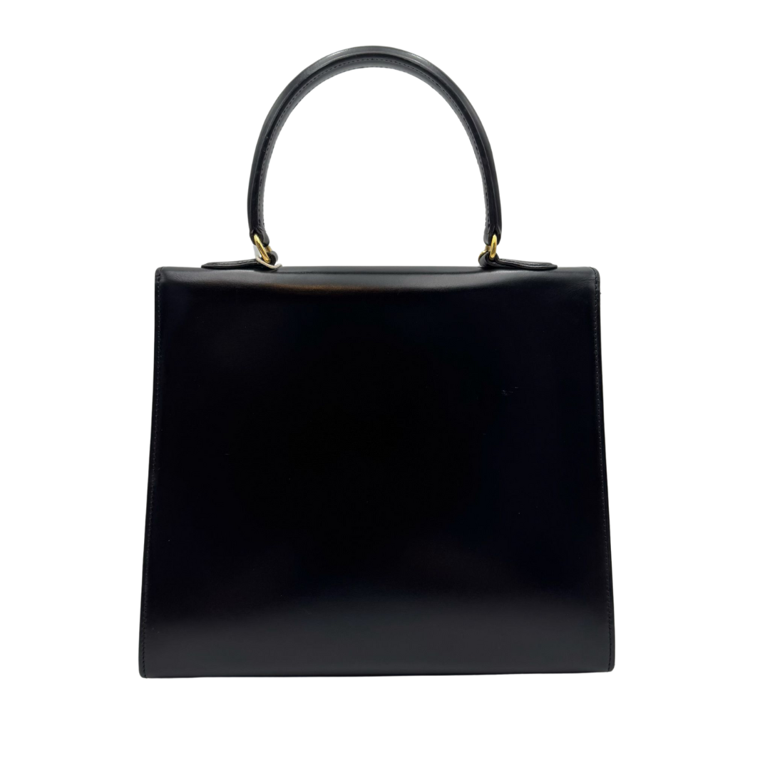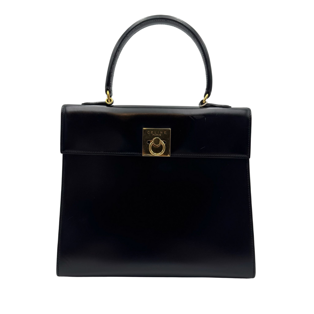 This Celine vintage top handle bag is a timeless expression of classic sophistication. Crafted from smooth box leather, it features a clean, structured silhouette that radiates quiet elegance. The polished finish is complemented by a bold gold-tone square turn-lock closure, engraved with the Celine logo and accented with a signature ring detail—adding a refined focal point to the bag’s minimalist design.