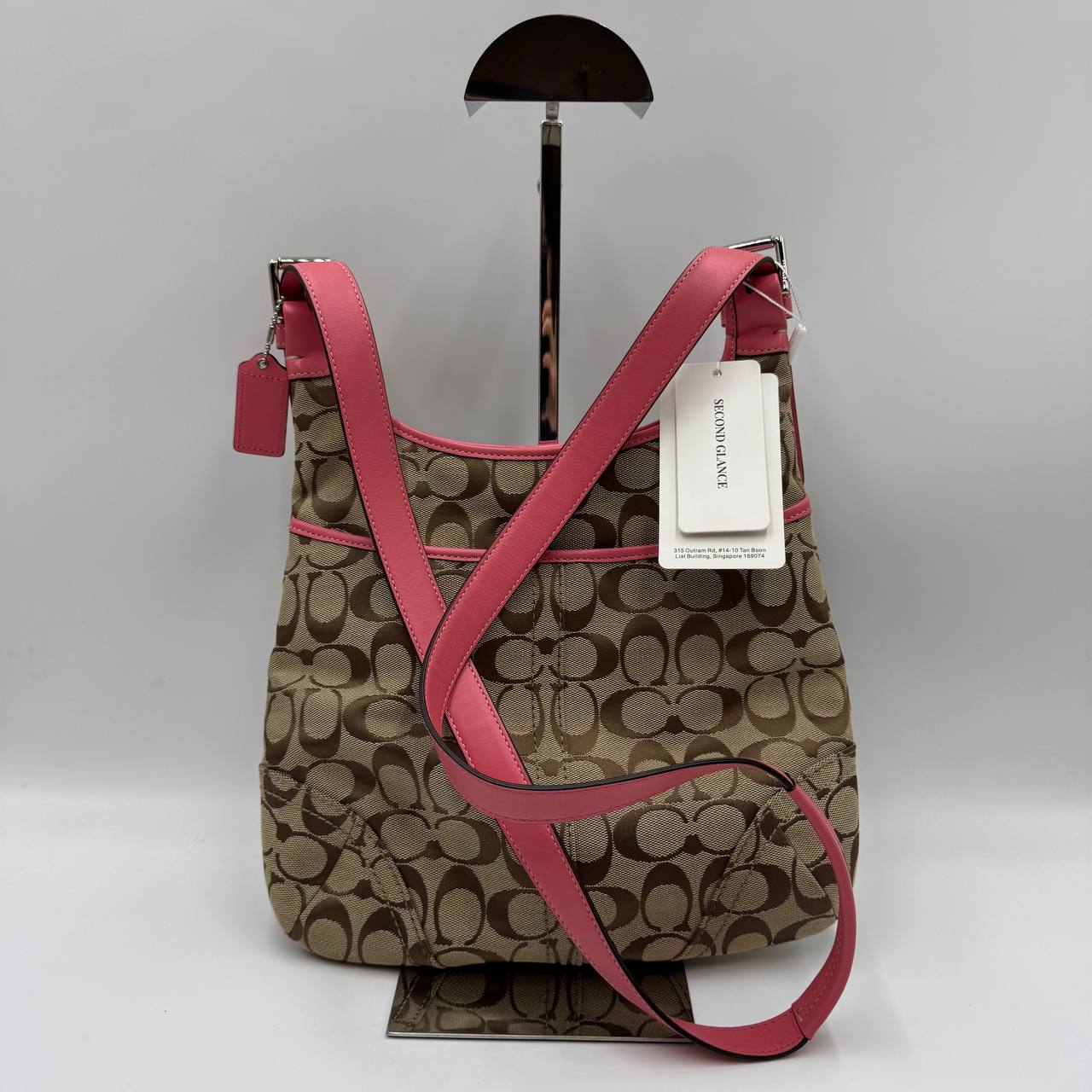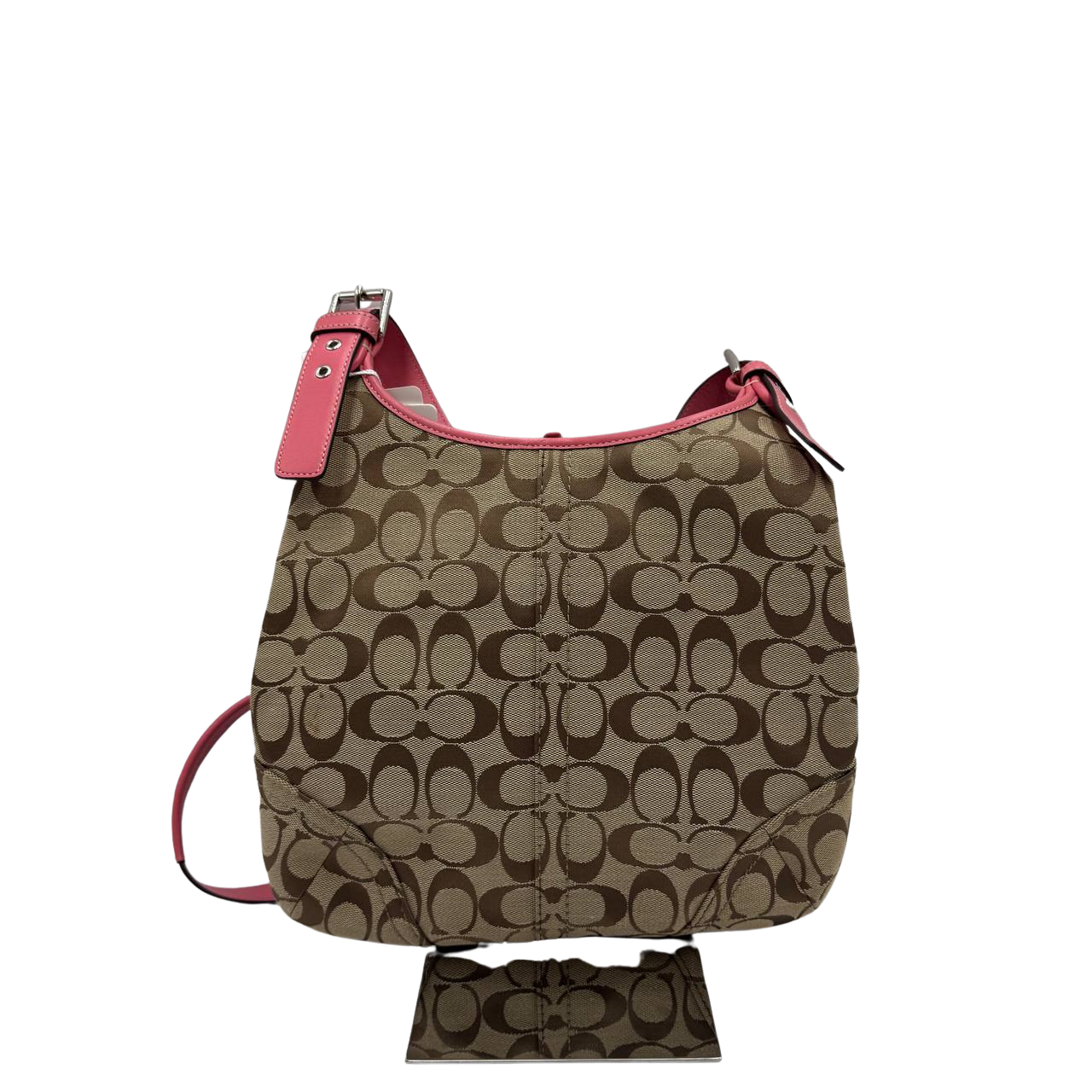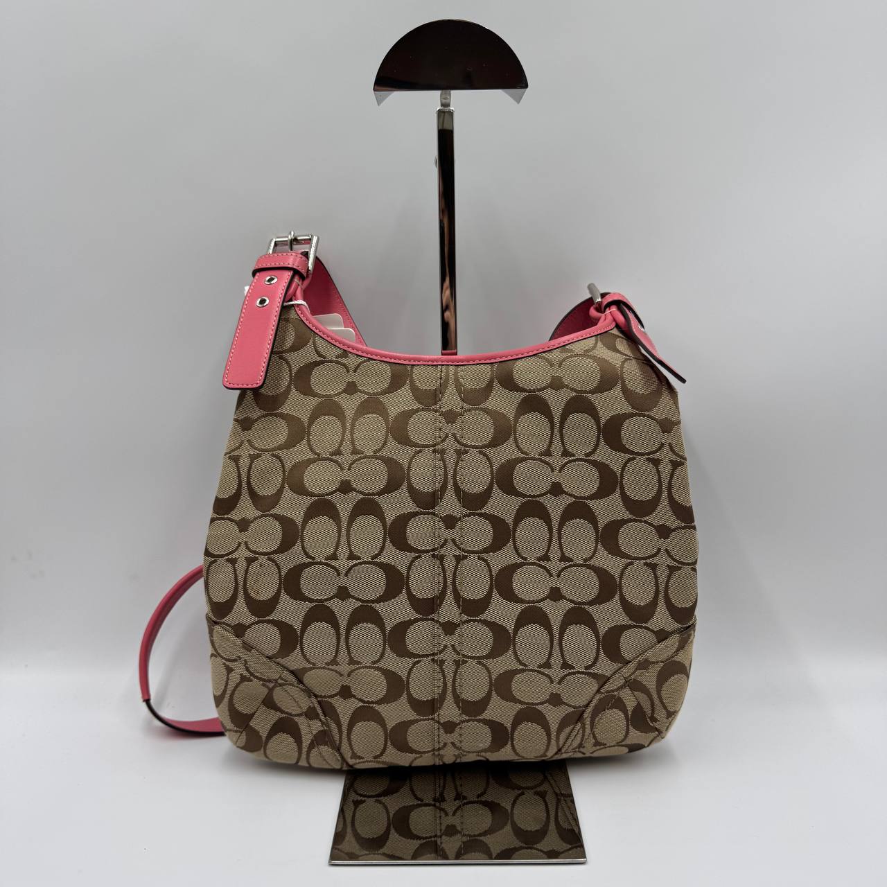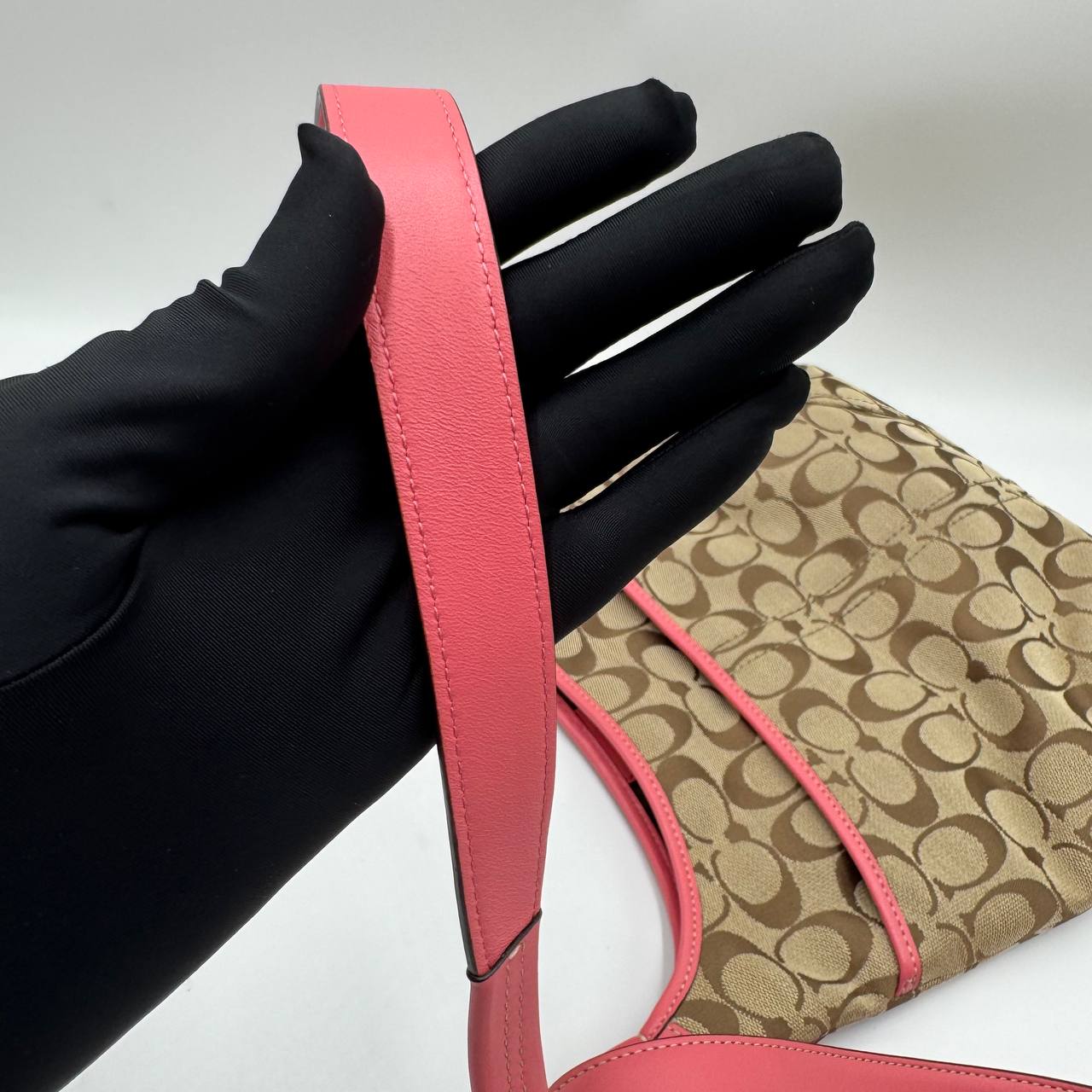 This charming Coach Signature shoulder bag is crafted from the brand’s iconic Signature coated canvas in classic beige and brown tones, accented with pink leather trim and adjustable shoulder straps for a playful yet timeless look. The curved silhouette offers a relaxed, easy-to-wear style that’s perfect for everyday use.