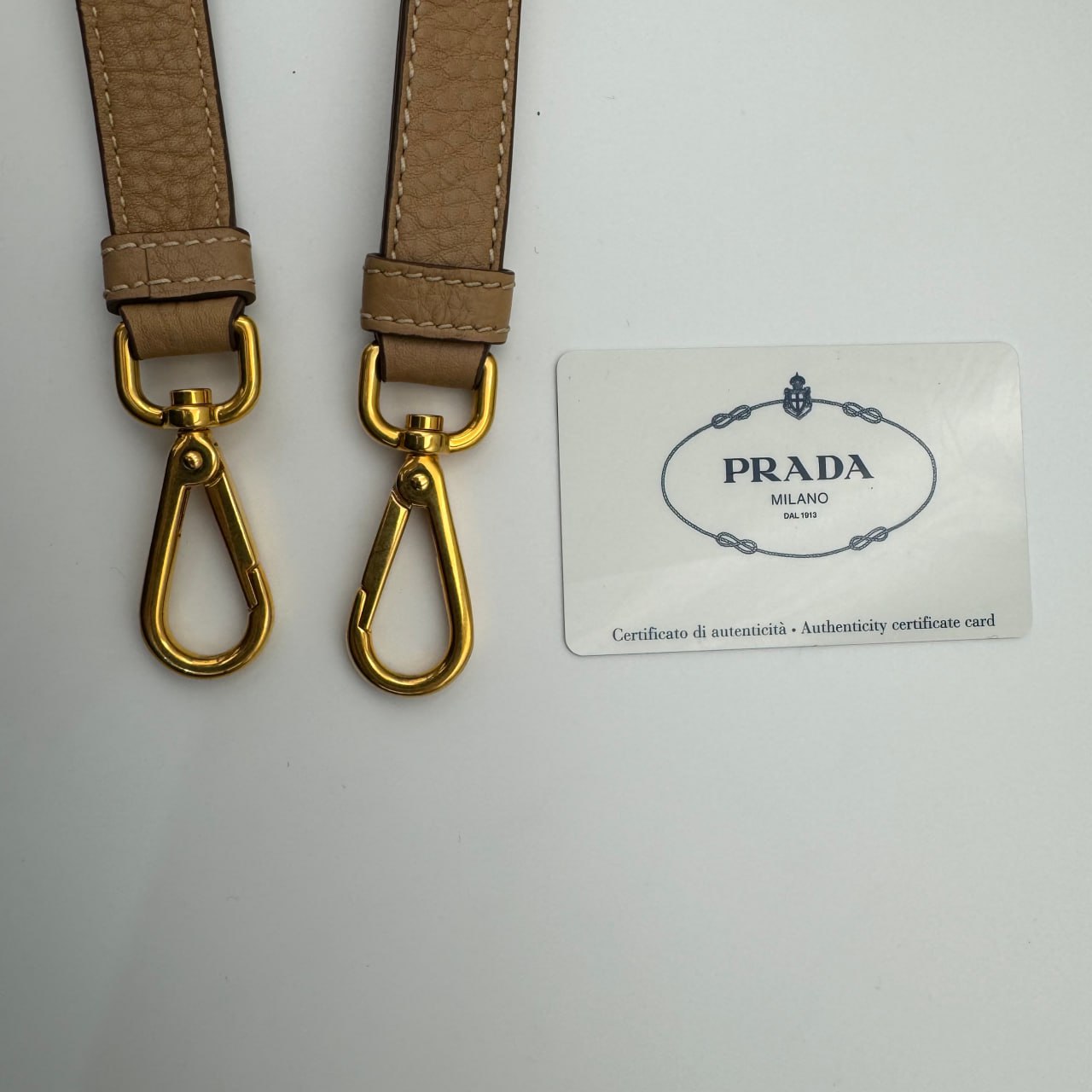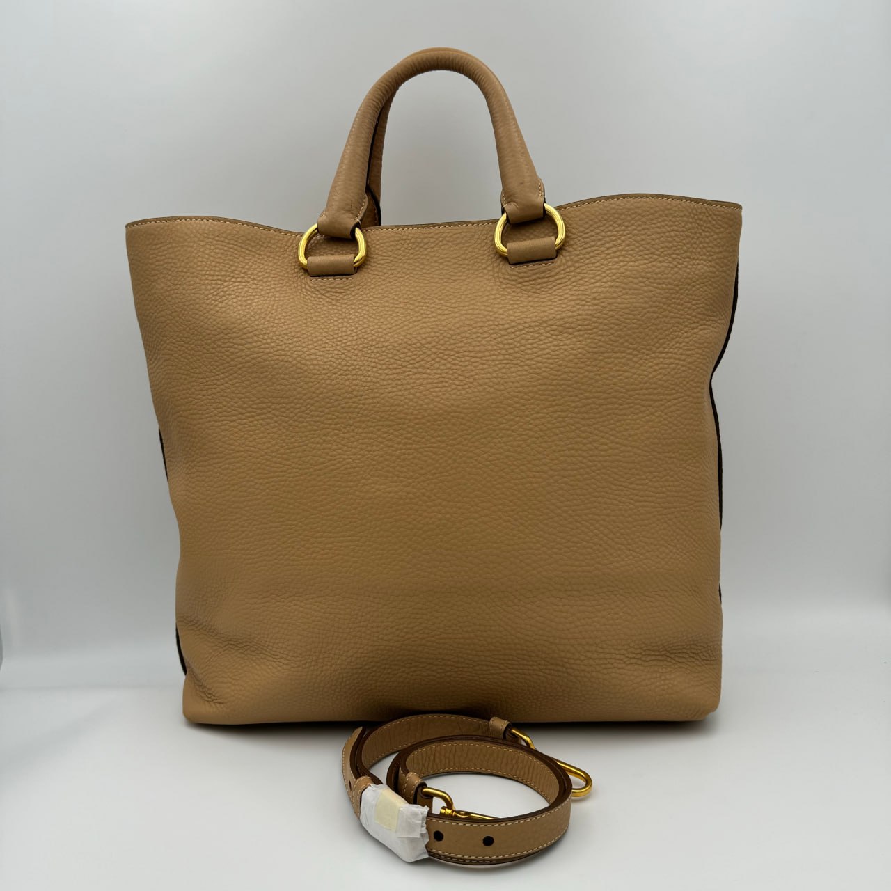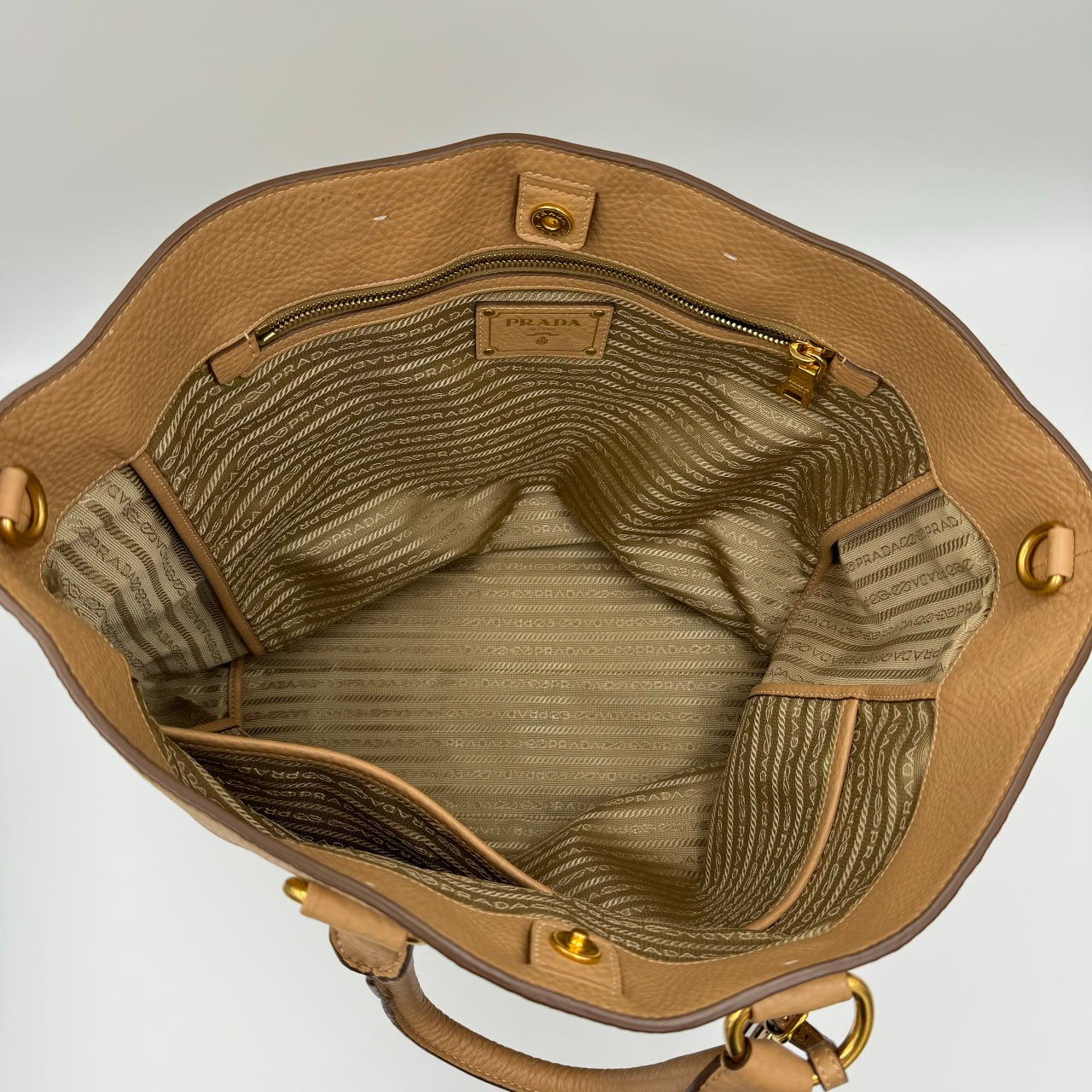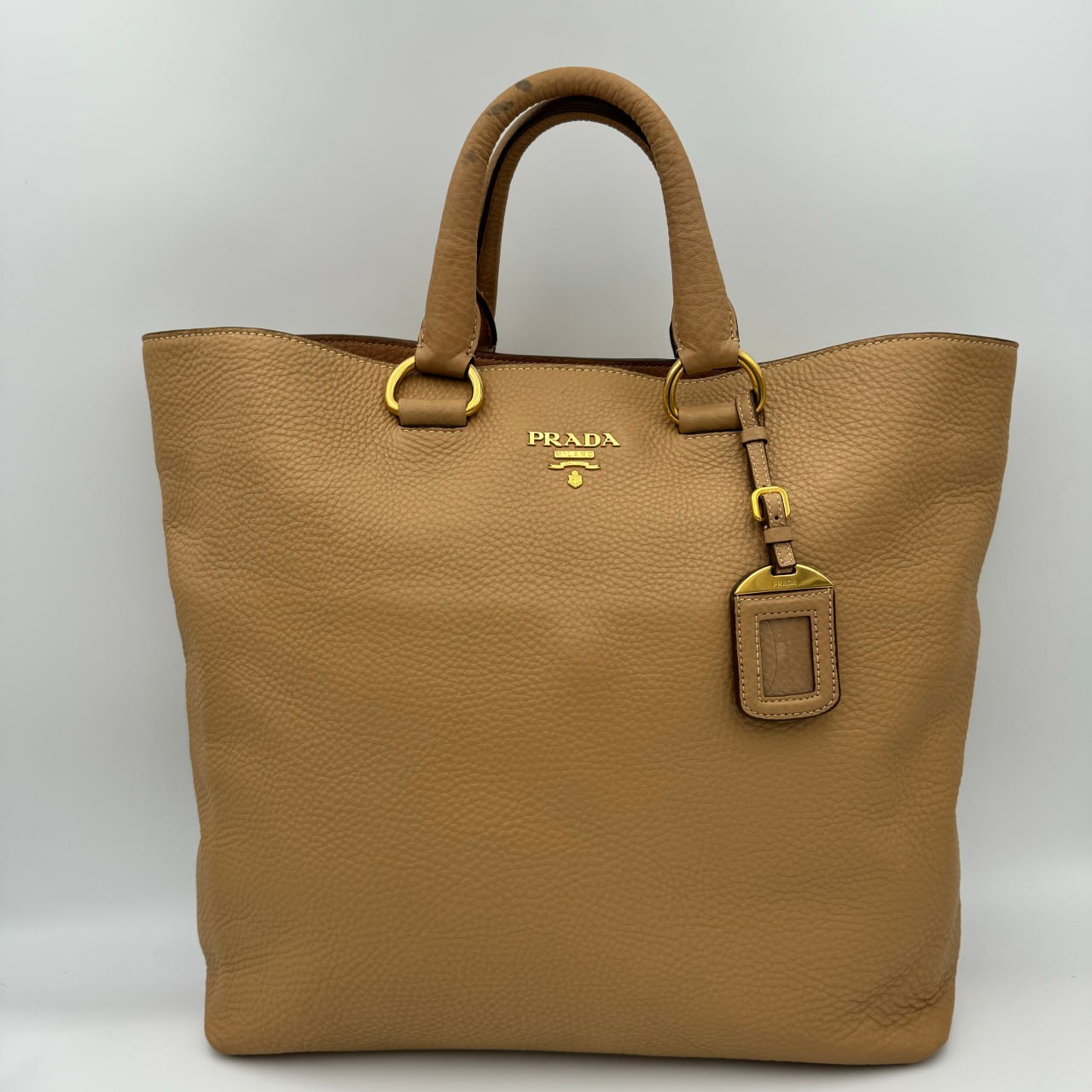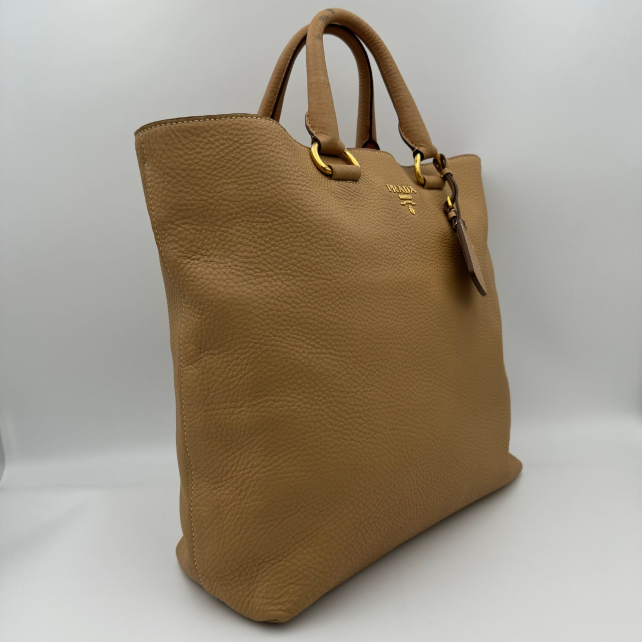 The Prada Daino Leather Tote Shoulder Bag is an Italian-made tote bag made from luxurious Daino leather. It has a unique grained texture, two rolled top handles, a detachable shoulder strap, a magnetic fastening, an internal zip-fastening pocket, an internal logo patch, and a leather tag. The bag also has silver-tone hardware.