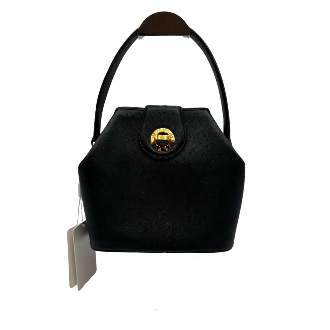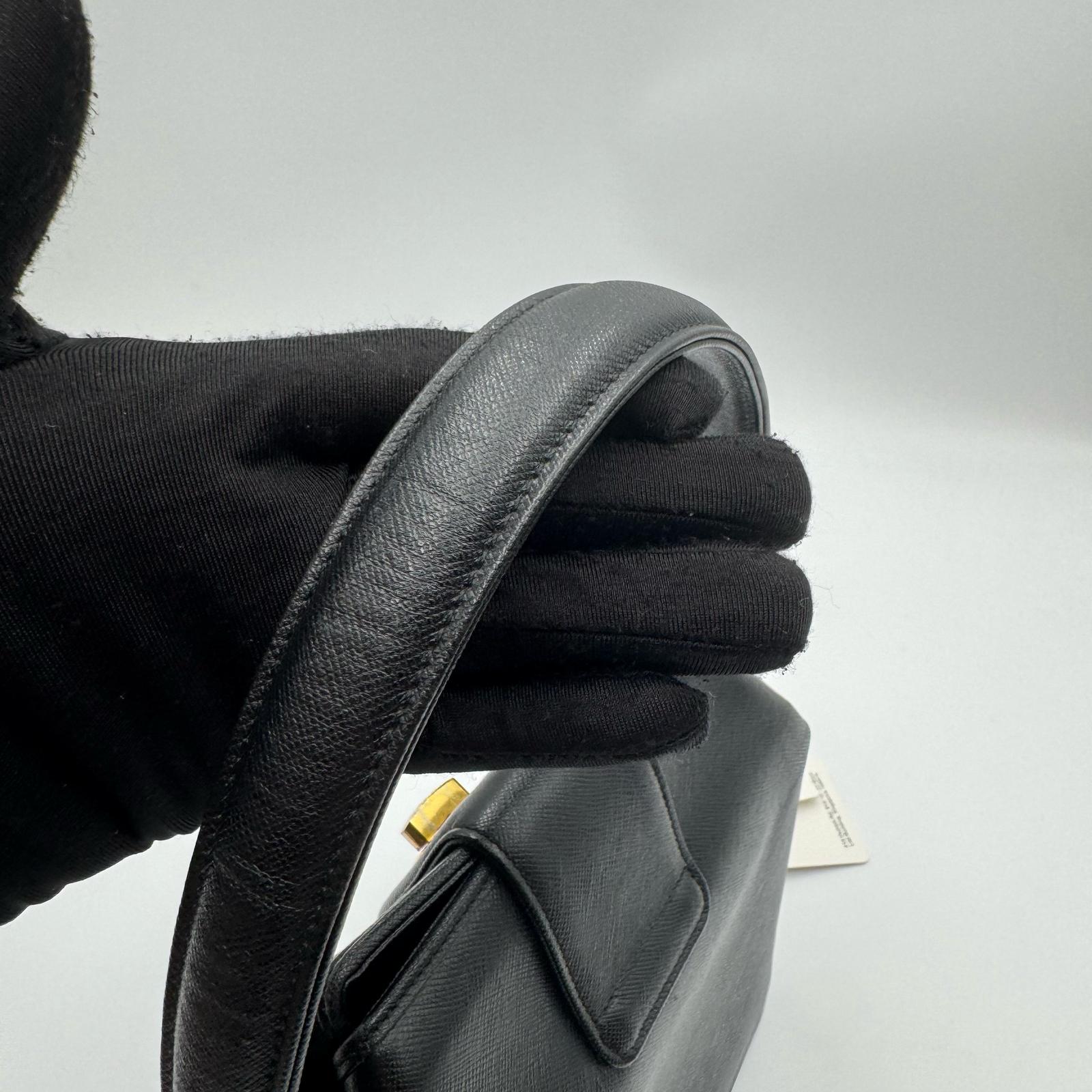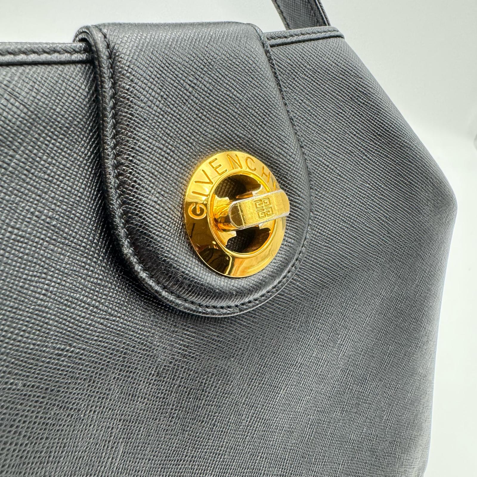 This Givenchy Vanity Bag offers a structured, compact design crafted from smooth black leather. Its boxy silhouette is accented with silver-tone hardware and features a top handle for handheld use, along with a detachable strap for shoulder or crossbody wear.