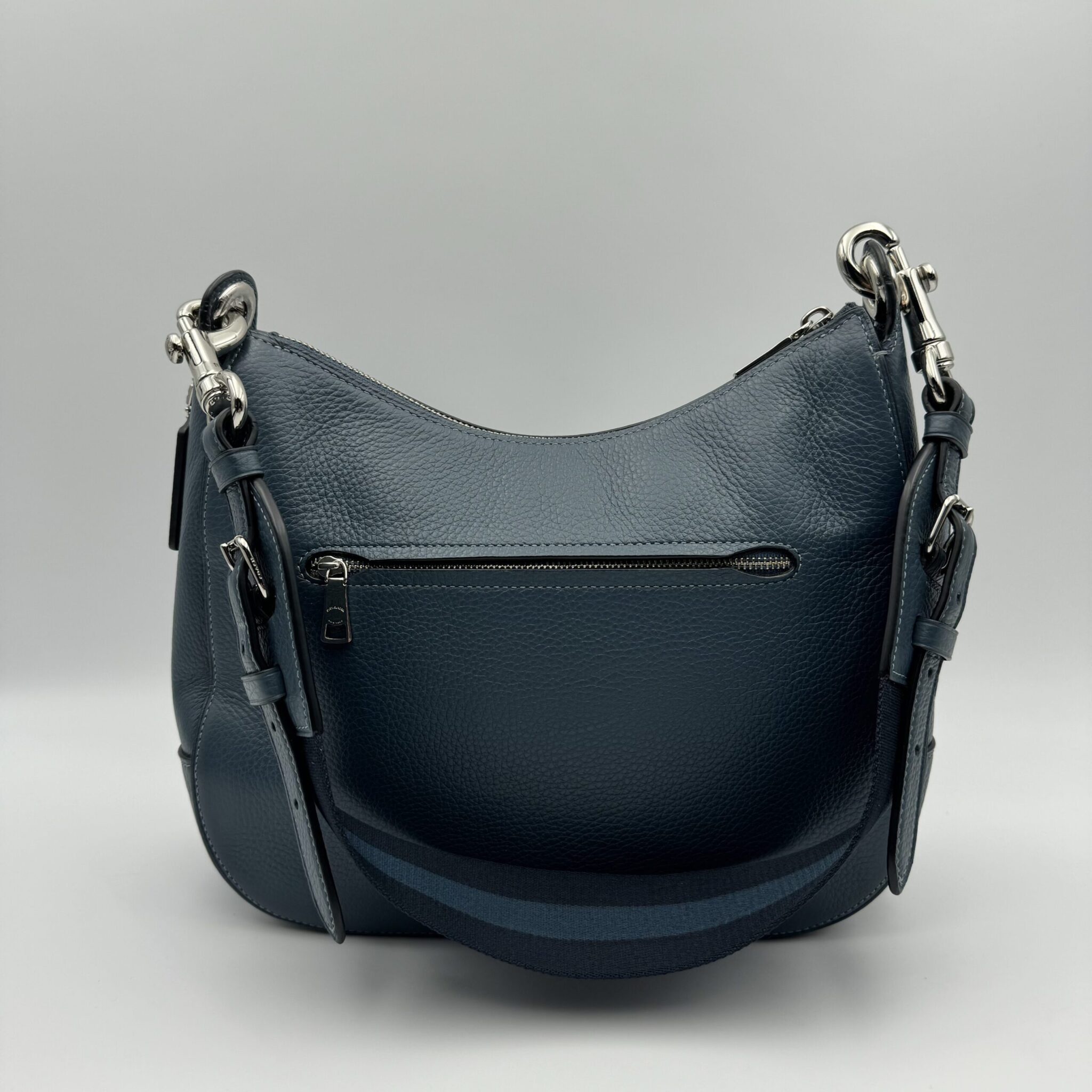 The Coach Jes Hobo Shoulder Bag is a large, crescent-shaped bag made of refined pebble leather. It has a fabric lining, zip-top closure, and a detachable strap with a 14 1/4 inch drop. The bag has multiple pockets, including an inside cell phone pocket, multifunction pockets, and an outside zip pocket. It also has a reinforced stand-up bottom and a stitched leather Coach Storypatch