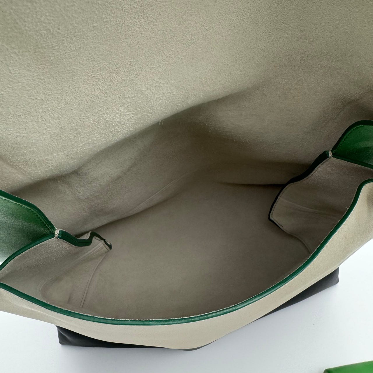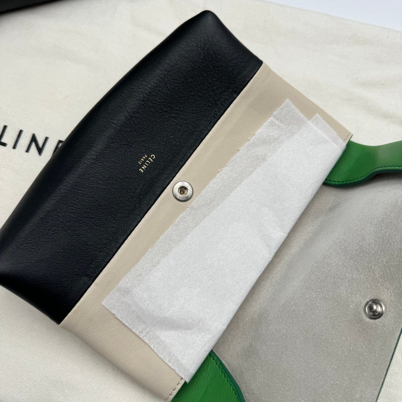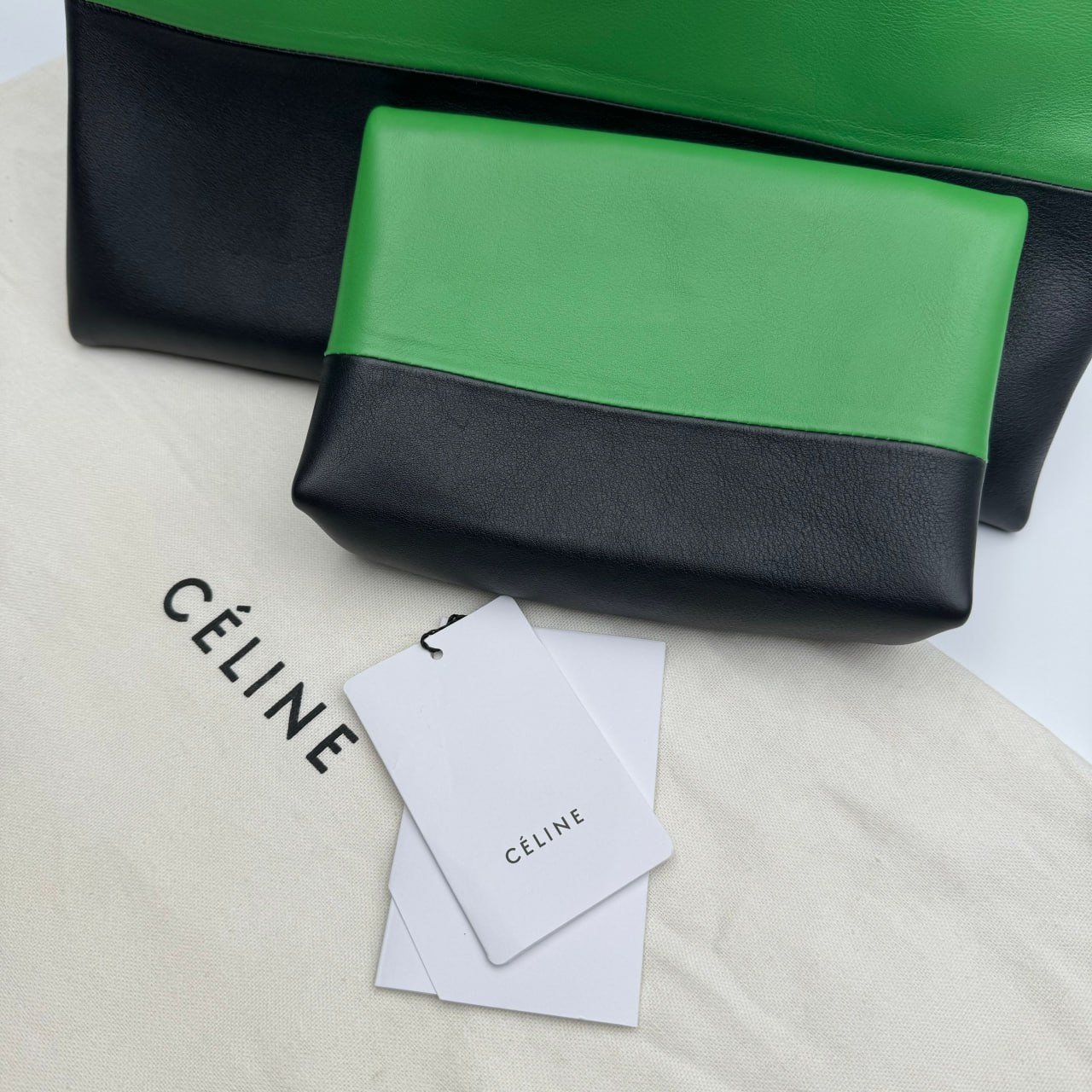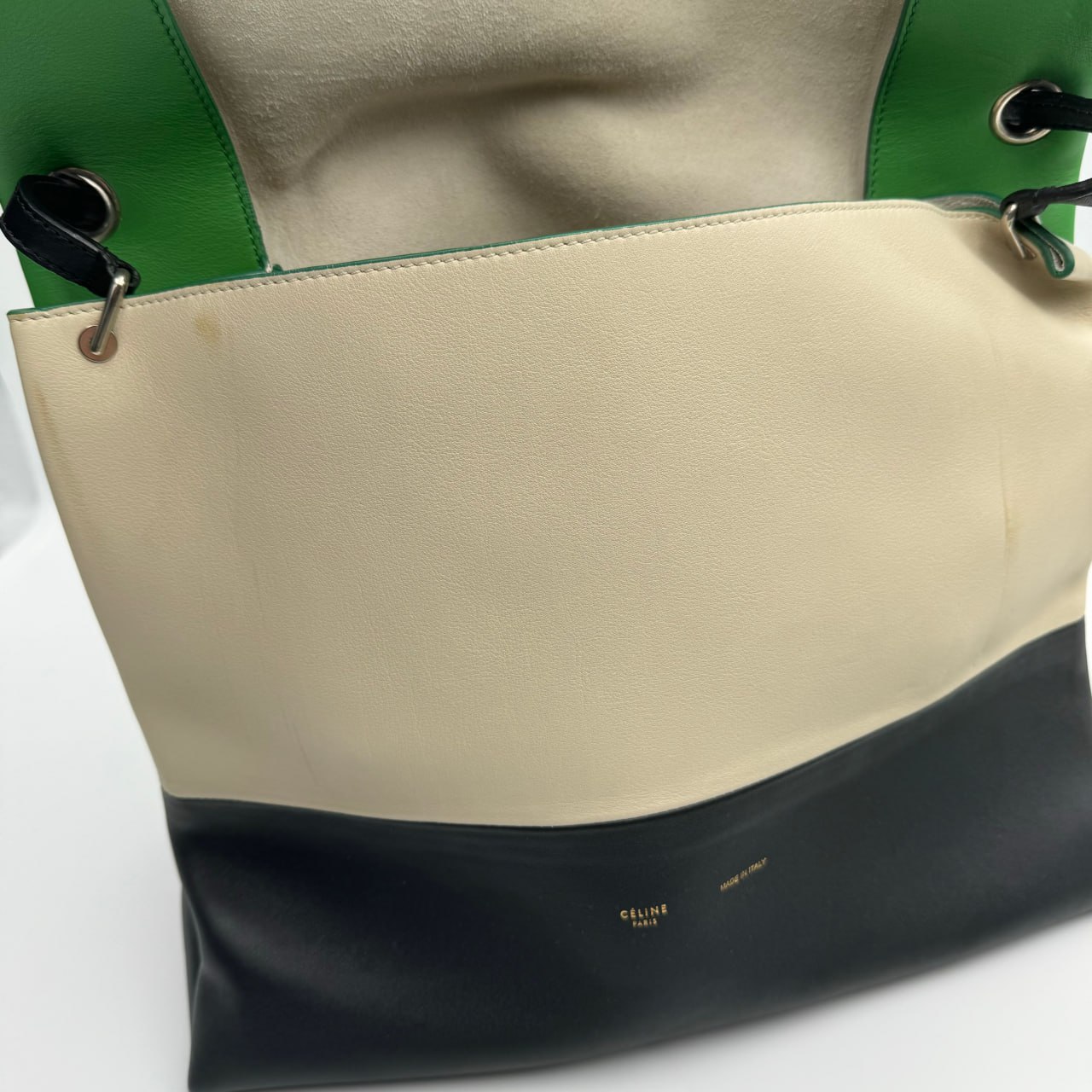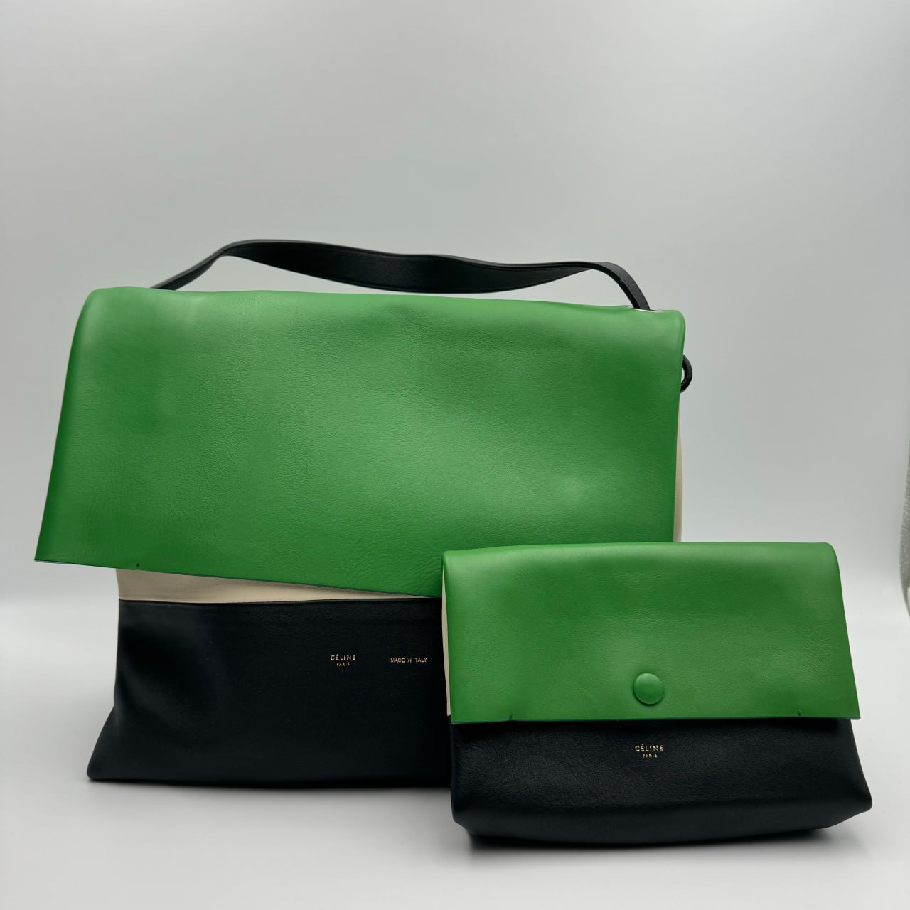 The Celine Tri Color Leather All Soft Shoulder Bag is a lightweight, handmade bag made of red, grey, and white calfskin. It has a structured minimalist design, a single leather shoulder strap, and a small matching pouch. The bag is 27 cm high, 16.5 cm wide, and 35 cm long.