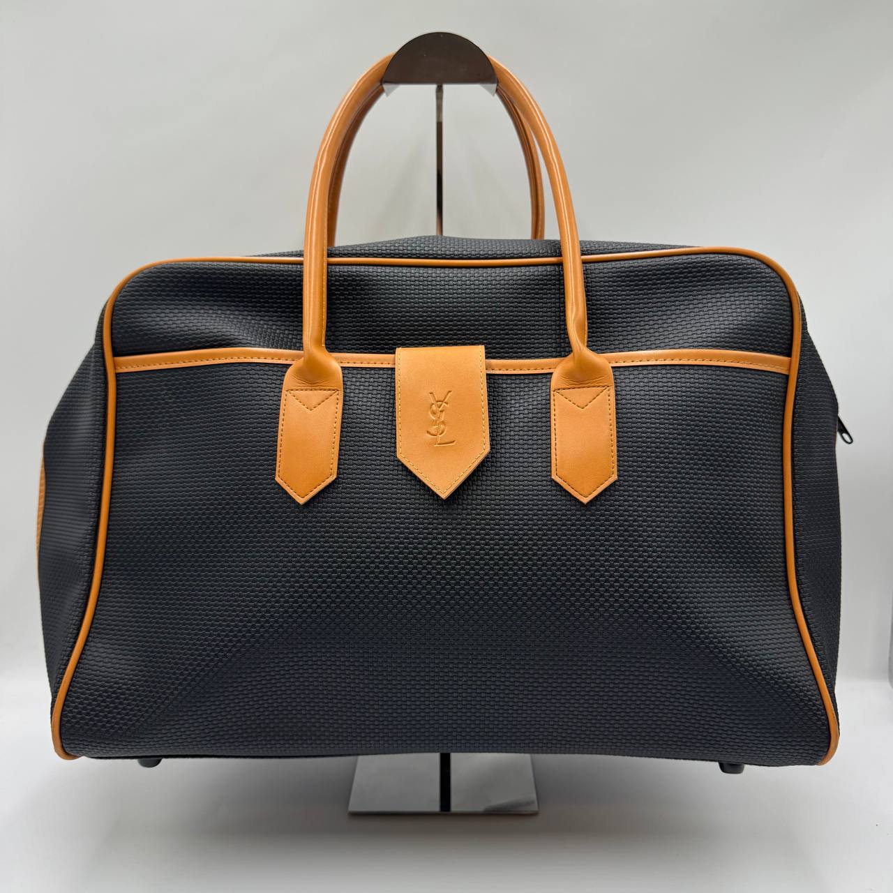This elegant Yves Saint Laurent top handle bag features a structured silhouette crafted from textured black leather, accented with contrasting tan leather trims for a refined, timeless look. The front is finished with a subtle YSL logo leather tab, adding understated brand recognition without overpowering the design.